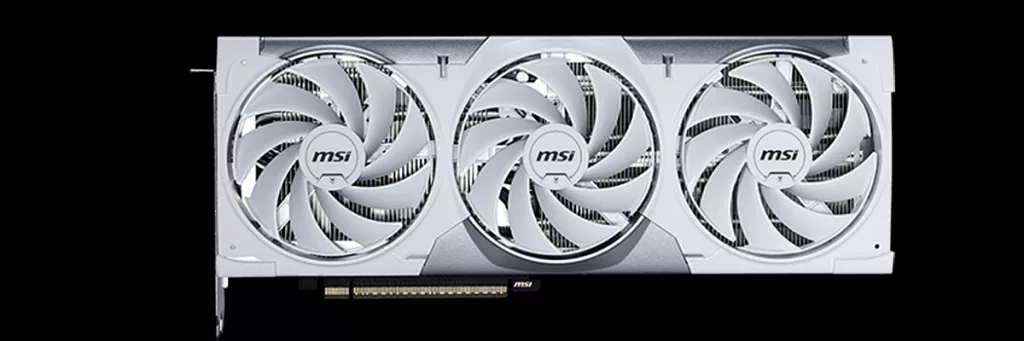 The video card has been designed to conform to the MSI Project Zero aesthetic, so it is primarily white with silver accents. This complements every piece we have reviewed thus far. The top shroud is plastic with raised fan cowlings. The TORX 5.0 fans are 90mm nine bladed double ball bearing fans. There are three groups of three blades joined at the periphery, which MSI calls Ring-Arc. This design is touted to increase airflow by 23%. The heatsink is full-length and quite generous, but surprisingly lightweight.
