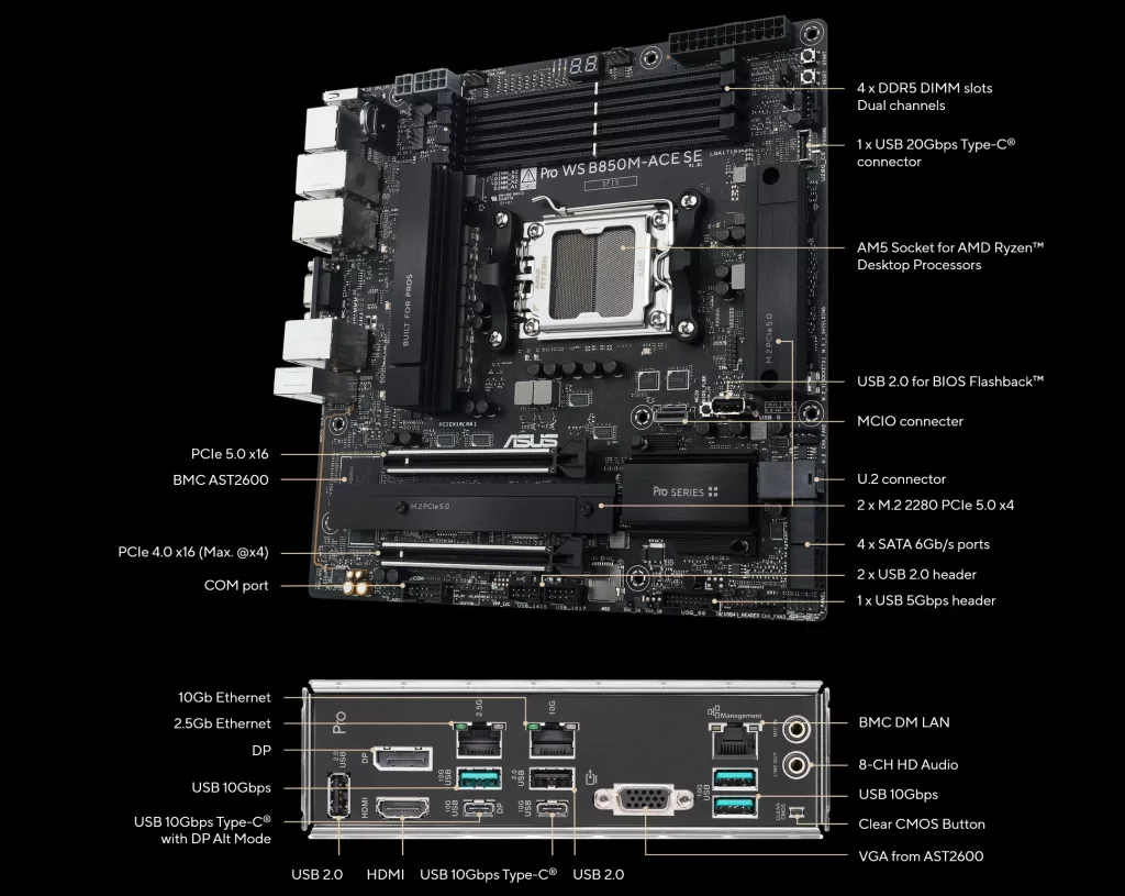“The Pro WS B850M-ACE SE empowers workstation users of all levels by maximizing the performance of the latest AMD Ryzen™ processors via 8+2+1 team power stages, DDR5 slots, PCIe® 5.0 and lightning-fast connectivity including a front USB 20Gbps Type-C® connector, plus 10Gb and 2.5Gb Ethernet.