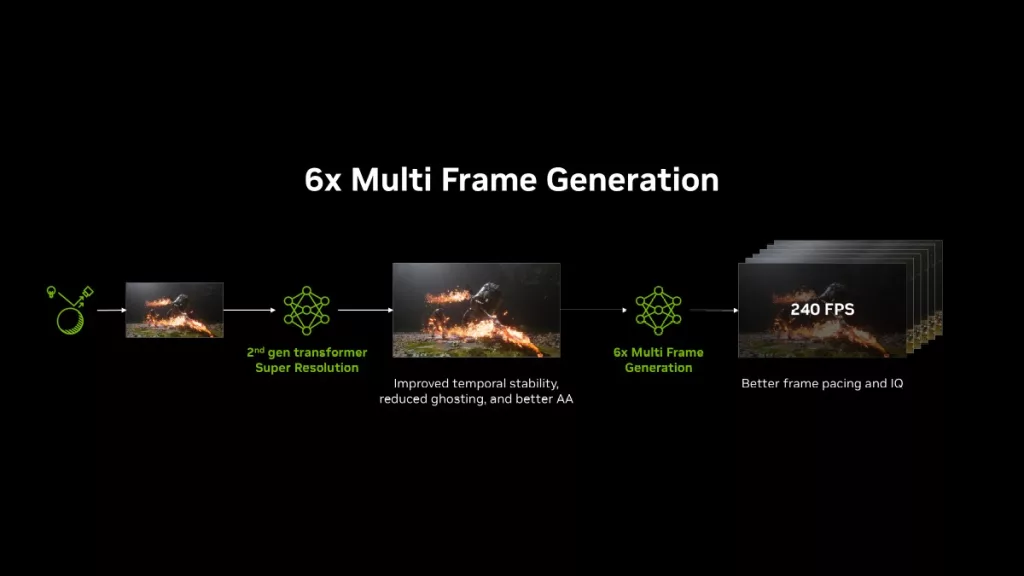 NVIDIA’s biggest bragging point for DLSS seems to be its upgraded multi-frame generation, which is now capable of up to 6X more frames when combined with a new feature called Dynamic Multi Frame Generation. The goal here seems to be to produce enough frames for 240 Hz and 360 Hz displays. The 6X mode is exclusive to RTX 50 series GPUs, which makes sense previous max value was also limited to the Blackwell GPUs. NVIDIA has said that the 6X mode will become available in Spring 2026. Dynamix MFG allows users to define an FPS goal, and the GPU will employ the appropriate MFG settings to reach that goal while attempting to minimize system latency. The GPU will also detect the monitor refresh rate to “shift” between MFG modes in order to match the refresh rate.