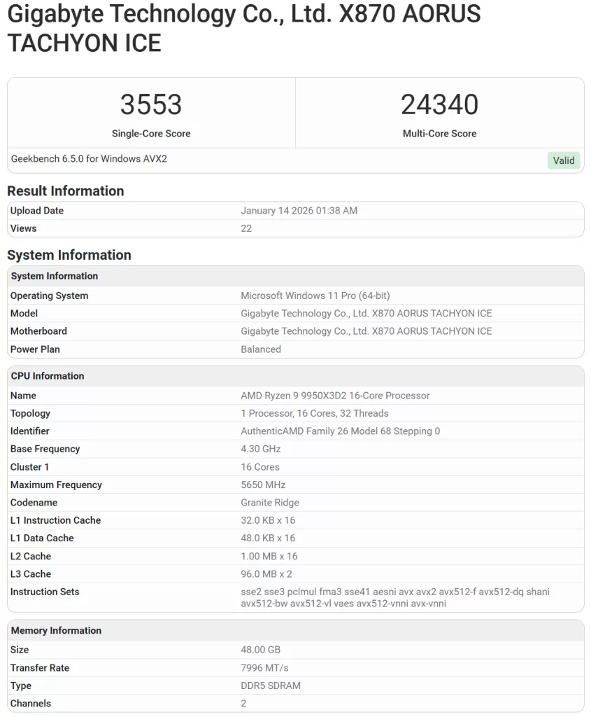 If this truly is the 9950X3D2 processor with 2x 8-Core CCDs, each paired with its own 96MB 3D cache, then it would appear to be running at the rumored factory specs. These are the 4.30 GHz base clock with a boost clock of 5.6 GHz, paired with 48 GB 7996 MT/s of DDR5 memory on GIGABYTES top-end AORUS TACHYON ICE X870 motherboard. As impressive as these single-thread and multi-thread scores are, they are still just a marginal improvement over the previous 9950X3D, which only featured a single CCD with the full 3D cache, and some have reported the overclocked predecessor was capable of achieving similar scores.