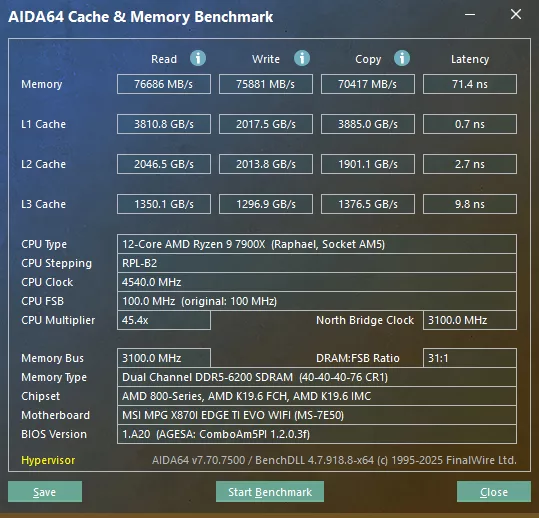 The next test is our memory testing using AIDA64’s Cache & Memory Benchmark. The MSI X870I EDGE TI EVO WIFI was able to achieve a read speed of 76,686 MB/s, a write speed of 75,881 MB/s, and a copy speed of 70,417 MB/s, all of which are a bit below what we have come to expect from the X870 platform with this CPU and memory combination, and much closer to the B850 scores we have seen.