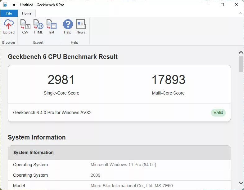 With V-Ray, we had a final score of 31,211, which is right at what we expect with this setup. Blender comes in at 195 for the Monster test, 135 for junkshop, and 104 for classroom, again right in line with expectations. Our final synthetic benchmark is Geekbench, where we hit a Multi-Core score of 17,893 and a Single-Core score of 2,981, which falls a bit short of previous testing.