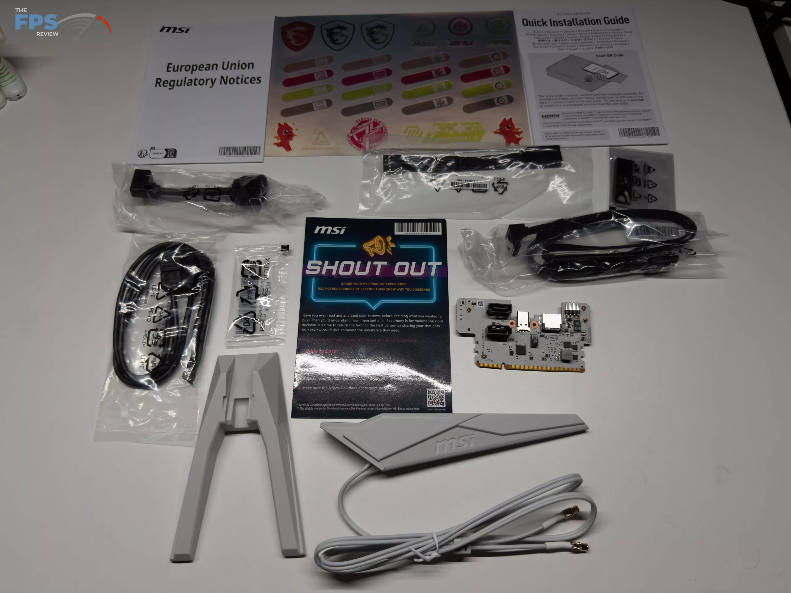 With the MSI X870I EDGE TI EVO WIFI coming in at a whopping $449.99 MSRP, there are usually plenty of extras included (wanted or not); however, that is not really the case with this motherboard, as it is more targeted at high-end performance in the smallest package possible. When you crack open the box you will two (2) SATA cables, an EZ Front Panel Cable, a 1 to 3 EZ Conn-Cable (V2), a cable for the 5-in-1 XPANDER USB 5Gbps port, the EZ WIFI antenna set of 3 M.2 screws, the 5-in-1 XPANDER card, a sticker sheet, the typical Regulatory notice and quick start guide, and a USB stick. This USB stick is pre-loaded with all the drivers and software you will need to get your system up and running.