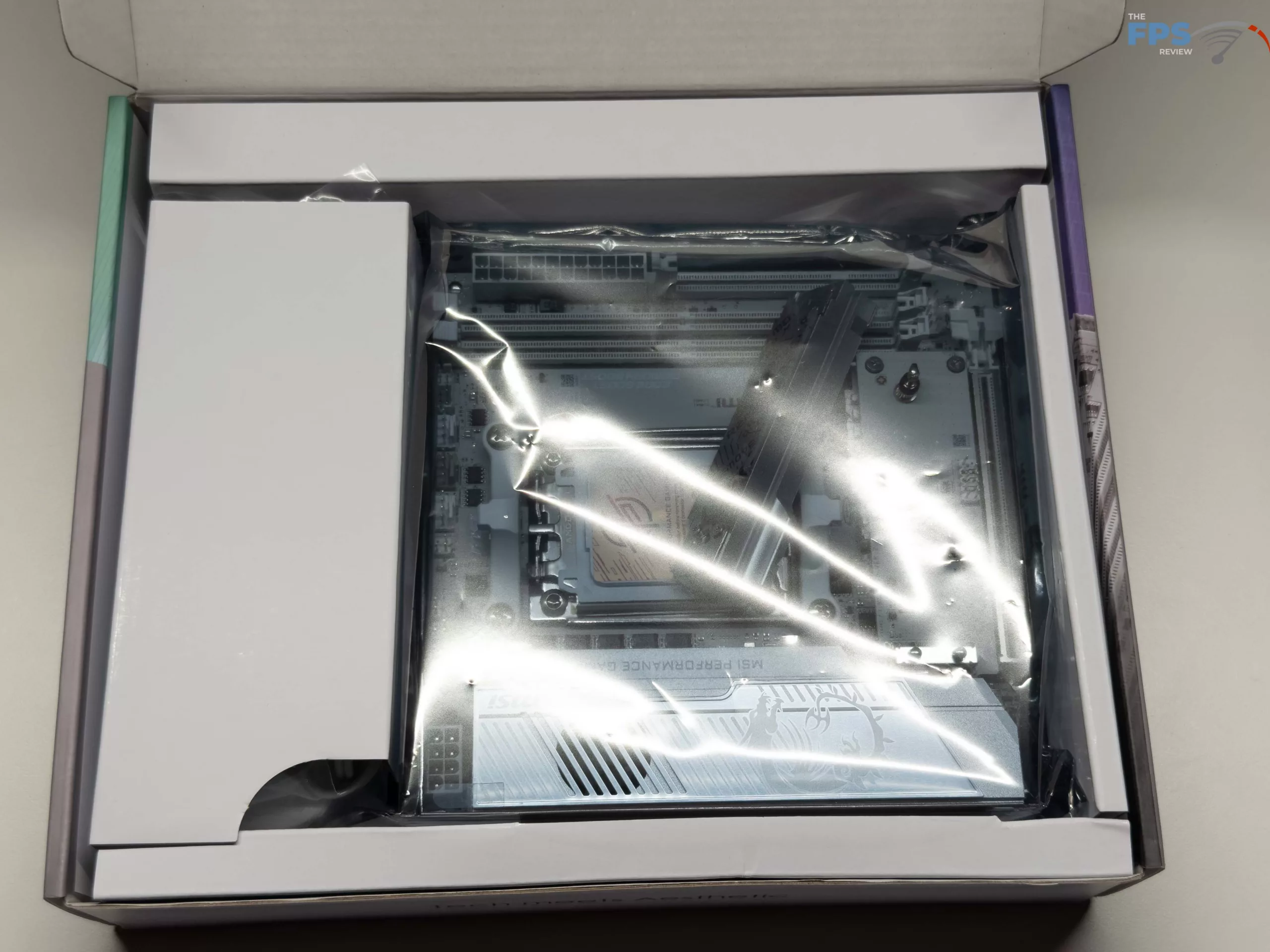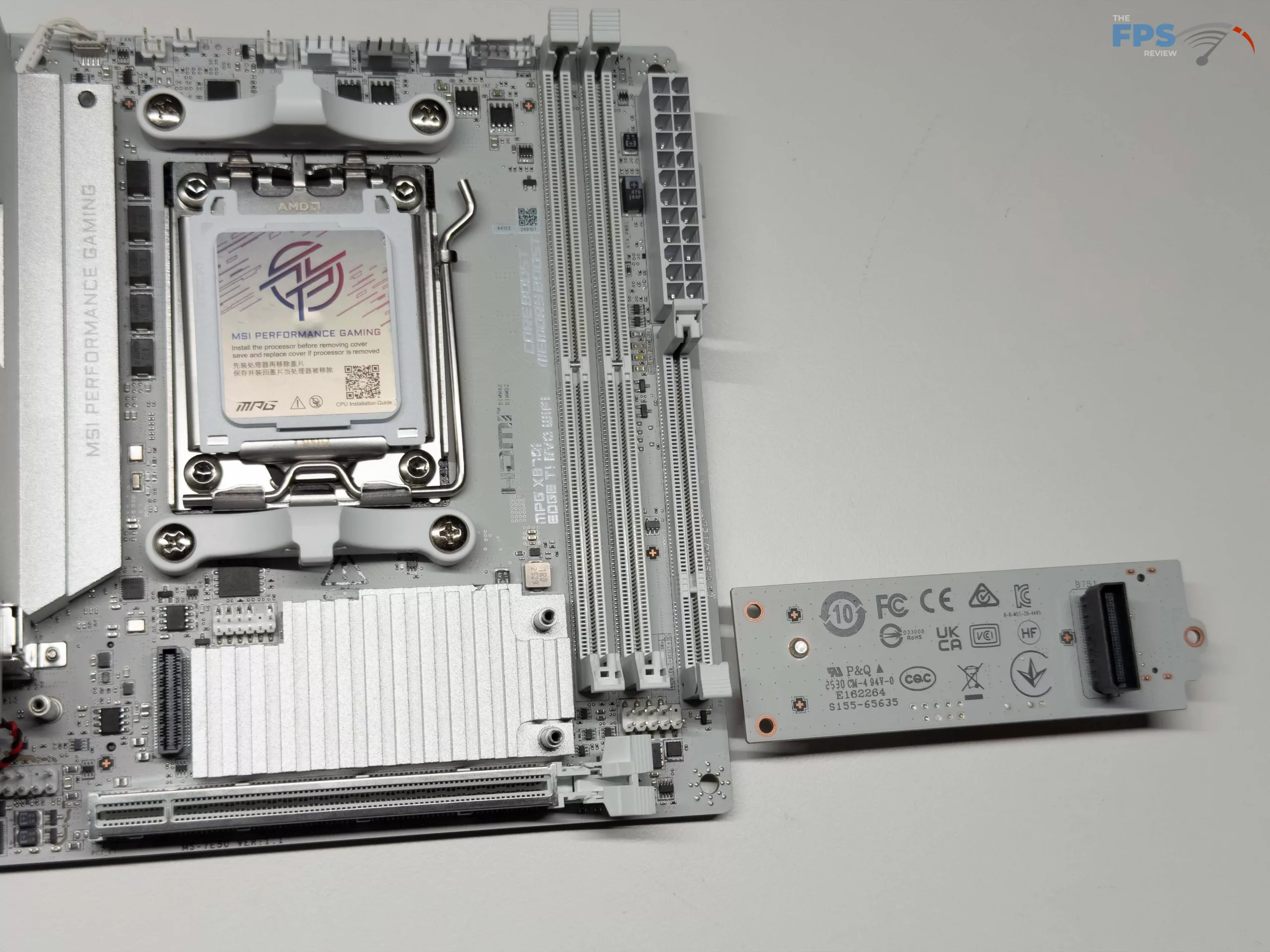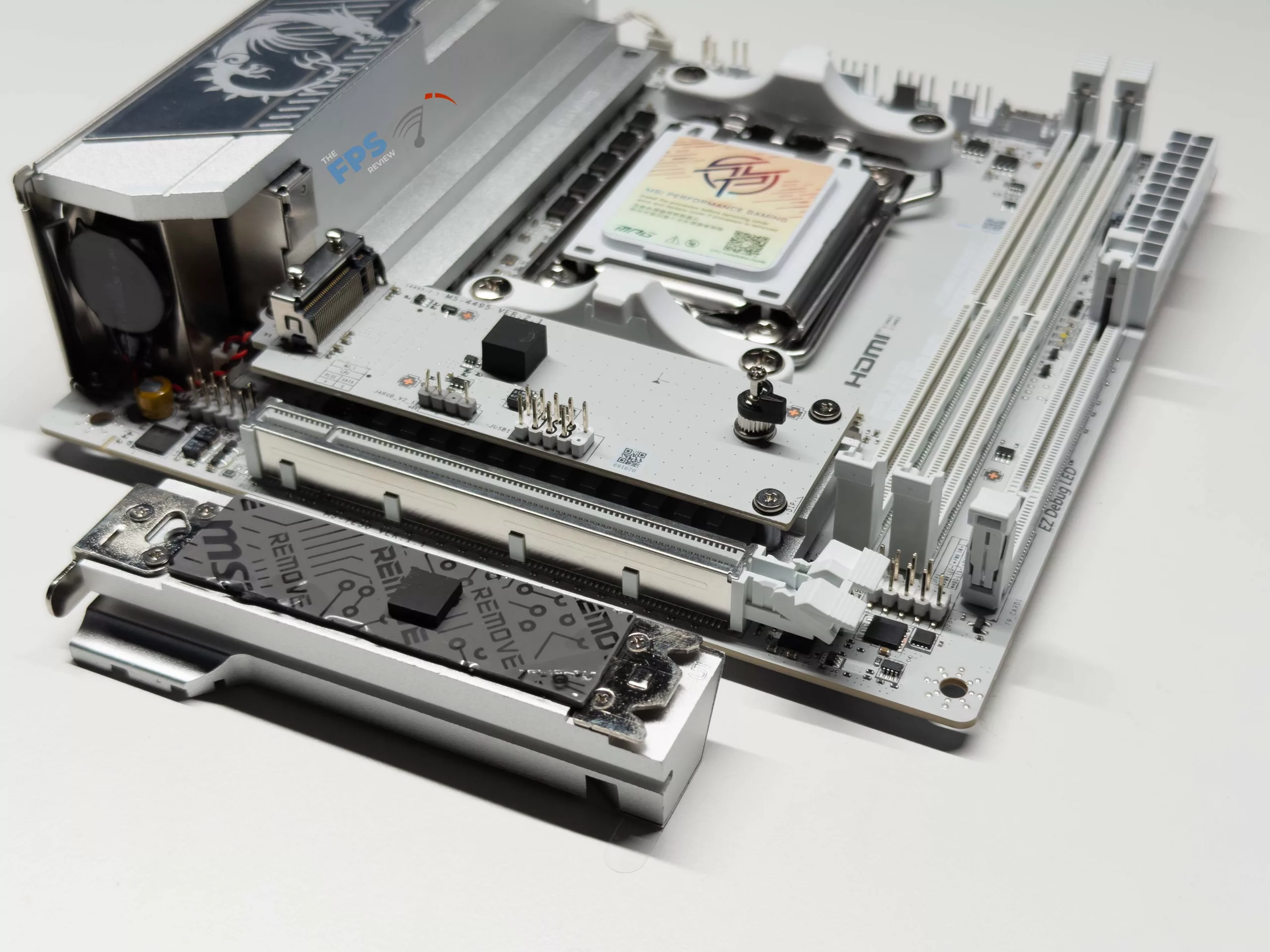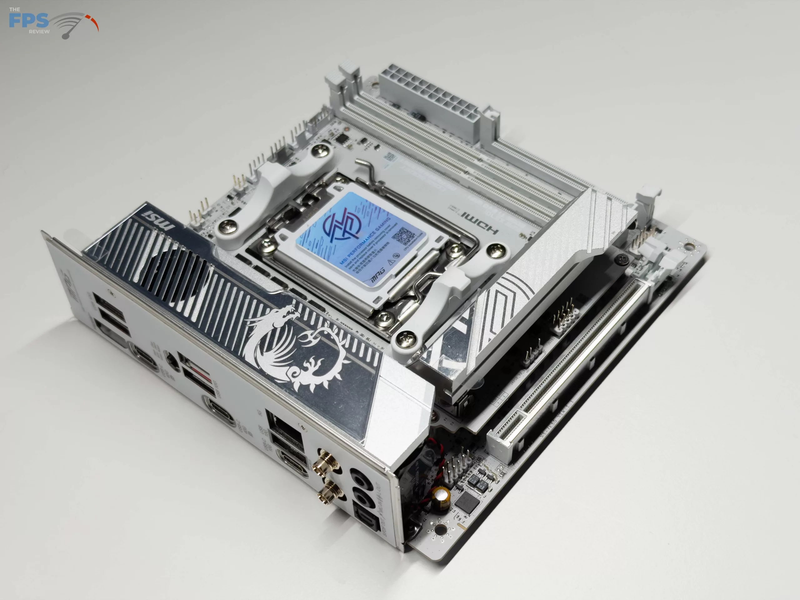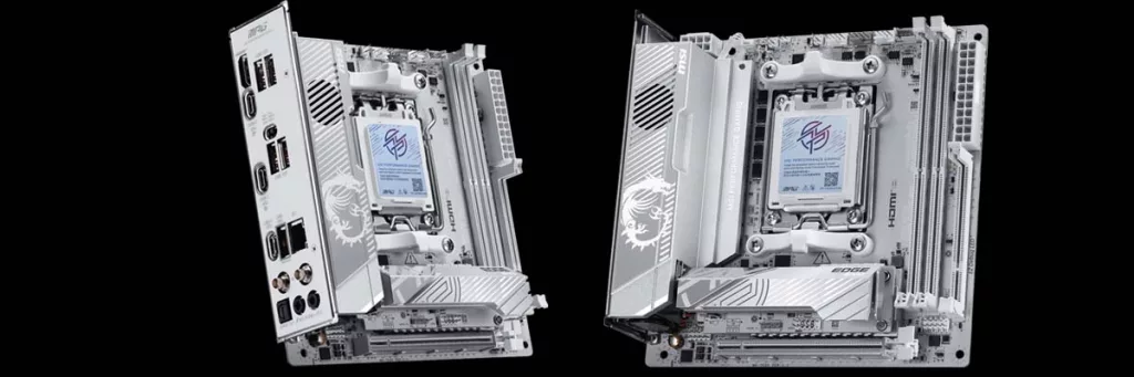 Like the other MSI MPG mini-ITX motherboards we have looked at, the MSI X870I EDGE TI EVO WIFI follows with the same overall white and silver color scheme that has been a staple of the recent EDGE series in the MPG line of motherboards. After this, MSI has included the two (2) DDR5 memory slots, two (2) M.2 slots native to the motherboard, however there are no SATA ports on the motherboard itself, instead in the location you would typically find it, is the XPANDER card we will touch on later. For cooling, MSI has gone full force with their FROZR setup on this motherboard, both with an oversized heat sink for the MOSFETs and the cooling for the primary NVME drive.