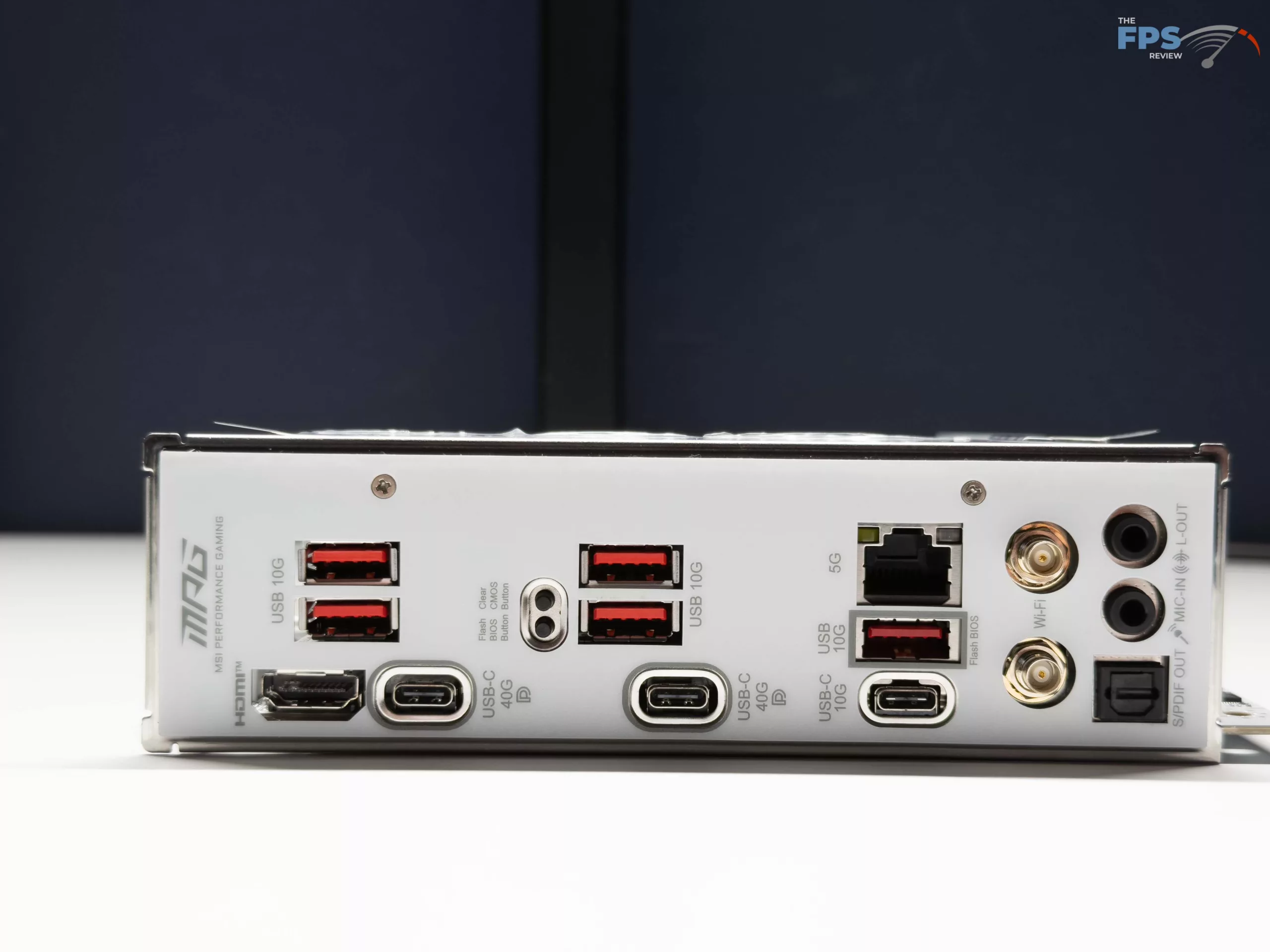 The MSI X870I EDGE TI EVO WIFI has some of the best I/O options we have seen on a mini-ITX motherboard so far. For the rear I/O panel, USB options are plenty, with two (2) Type-C 40 Gbps ports (Both of which support DisplayPort 1.4 standard for video output), one (1) Type-C 10 Gbps port, and five (5) Type-A ports at 10 Gbps maximum speed. After this, there is a single HDMI port for video out, the typical antenna connections for the WIFI 7 chip (a MediaTek MT7927), as well as a ethernet port for up to 5 Gbps through the Realtek 8126 controller. Beyond these connection options, there is a Clear CMOS button for clearing the BIOS if there is a bad configuration, as well as a Flash BIOS button to allow for flashing the BIOS without any CPU or memory installed. Lastly, there are the typical Line-Out, Mic-in, and S/PDIF ports for audio, all from the ALC4080 Codec, supporting up to 7.1 channel surround sound.