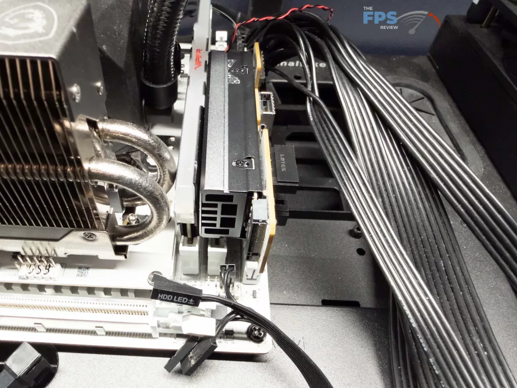 For SATA ports, there are none actually located on the motherboard itself; if you need to use them, the XPANDER card is required. The XPANDER card provides both of the SATA 6 GB/s ports, which MSI has positioned so that they point “out” of the card to allow for easier wiring.