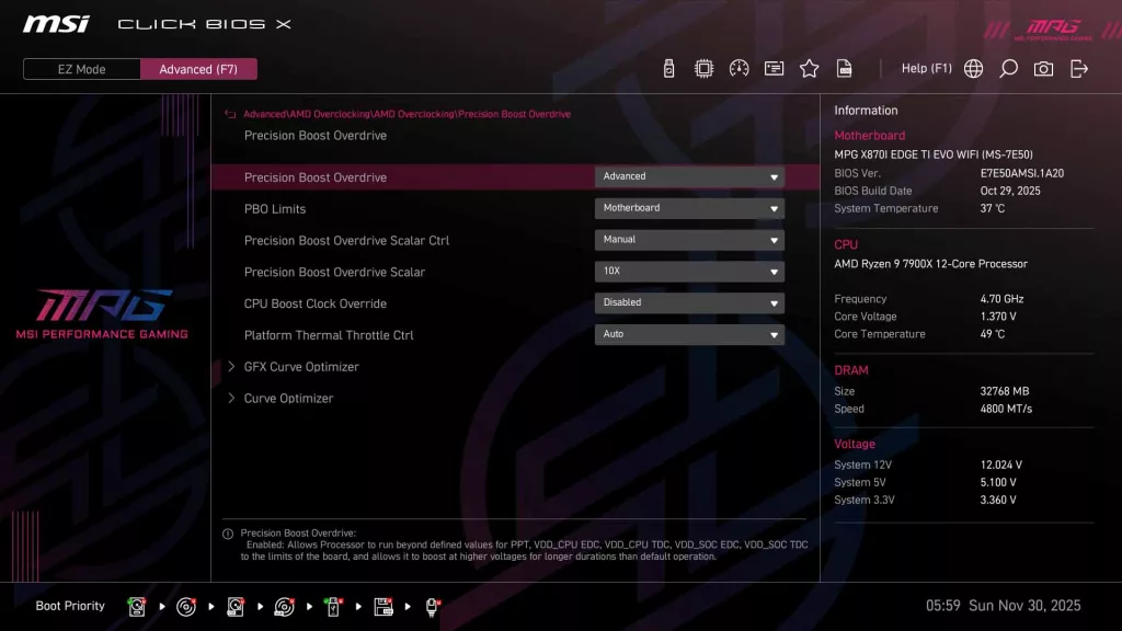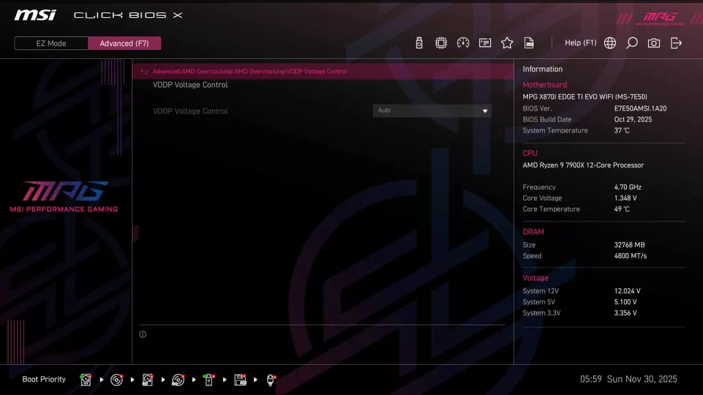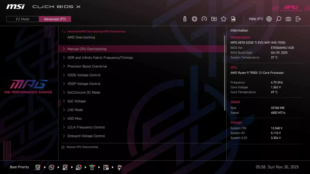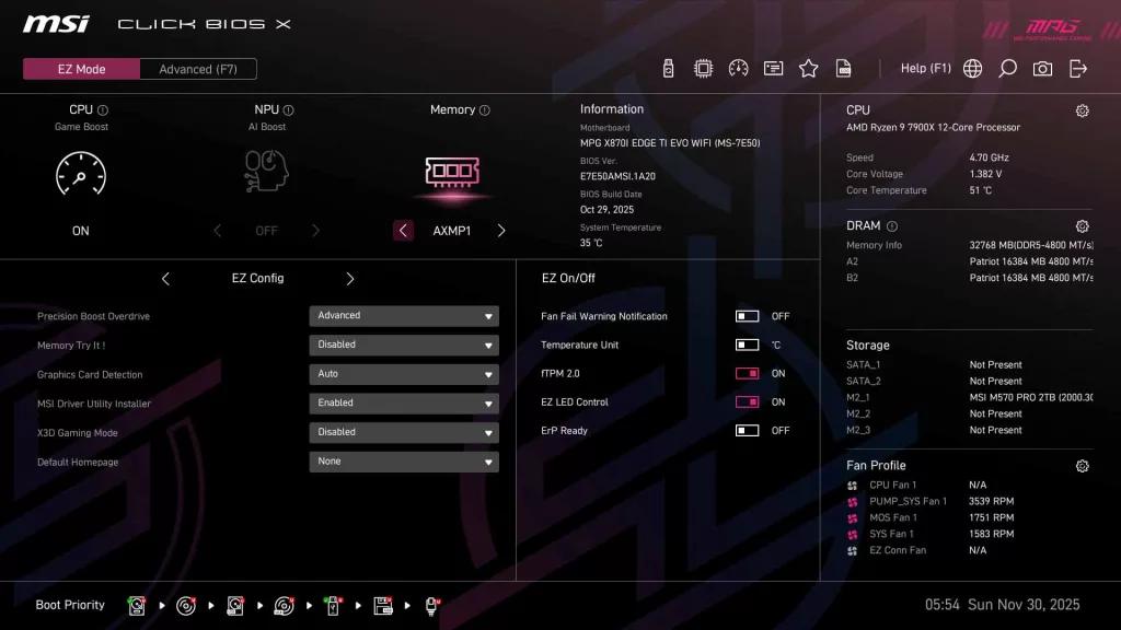 As we see on all current generation MSI motherboards, the MSI X870I EDGE TI EVO WIFI has MSI’s “Click BIOS X”, which we have come to appreciate for its ease of use. When you initially enter the BIOS, you are greeted with the standard EZ Mode, where you can quickly adjust memory settings and CPU boost, along with fan speeds/profile, as well as have a quick look at operating speeds for the CPU and memory.