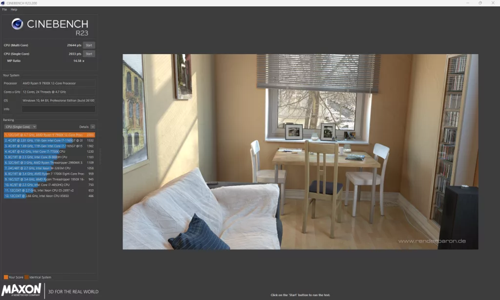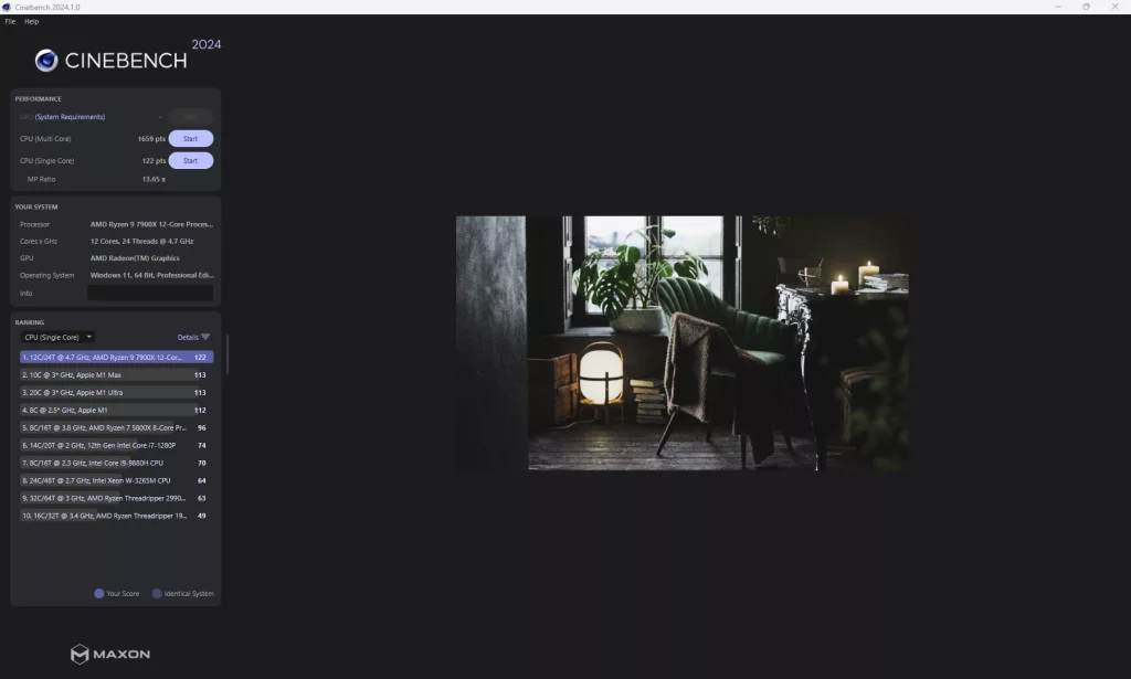 Our synthetic benchmark tests are up next, with 3DMark, PCMark, Cinebench (R23 and 2024), V-Ray, Blender, and finally GeekBench6. 3DMark comes in with a score of 13,120 for maximum threads in the CPU Profile test, and a CPU score of 20,648 for Night Raid with a total score of 10,195 (Includes full system). PCMark comes in with a total score of 6,972, which is a platform low we have seen with this CPU. After this, Cinebench R23 clocks in at 29,644 points on the Multi-Core, and 2,033 points on the Single-Core test, and 2024 comes in with 1,659 points and 122 points respectively, both Cinebench results bring us back to where we expect to be with our testing.