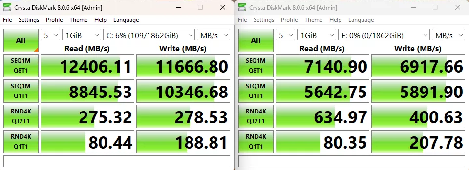 Our first test is the storage test and as we mentioned above, while we were able to test with both our MSI SPATIUM M570 PRO FROZR (originally reviewed at the end of 2023) as our primary drive, and our ADATA LEGEND 970 2TB NVME SSE in the XPANDER Slot, however due to the size of the motherboard and the location of the XPANDER slot, we are only using a single stick of memory in the system for this test only. On the M570, we recorded a read speed of 12,406 MB/s and a write speed of 11,667 MB/s, both of which were right in line with our expected speeds for the drive. The second slot is limited to Gen4 PCIe speeds, and as such, we were limited to 7,141 MB/s read speeds and 6,918 MB/s write, again right in line with what we have historically seen this drive do in this scenario.