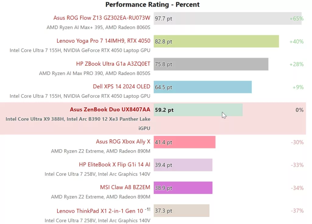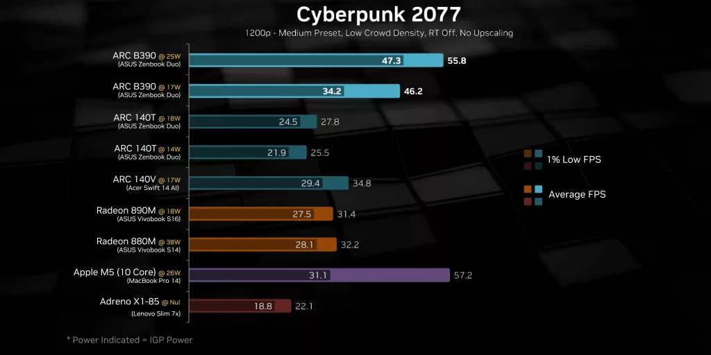 The Intel Arc B390/Panther Lake Package (aka Intel X9 388H) made an impressive debut at CES and is continuing to do so now in independent testing. The iGPU featuring up to 12 Xe-Cores is included in some Panther Lake packages and at moments has shown to compete favorably with NVIDIA’s GeForce RTX 4050 graphics card. AMD’s AI Max+395 still holds tops spots but the Arc B390 has shown itself to perform admirably in terms of power draw while outpacing the Radeon 90M iGPU by 63% while using only ~25W of power. The following are from ComputerBase, Hardware Canucks, The Phawx, and Notebook Check, all via VideoCardz (1, 2).