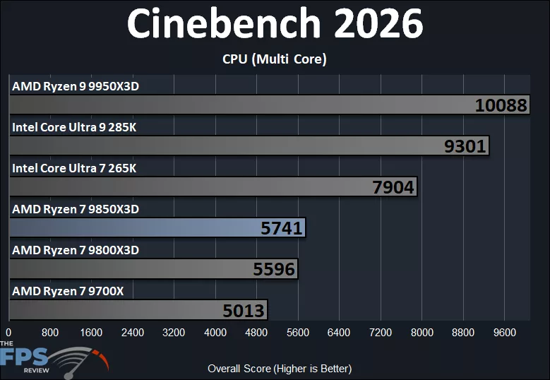 In Cinebench 2026 Multi-Core testing, we see the CPUs with more cores naturally do better. The Ryzen 7 9850X3D does still outperform the Ryzen 7 9800X3D by 3% here, and what’s more impressive is the 15% faster performance compared to the Ryzen 7 9700X.