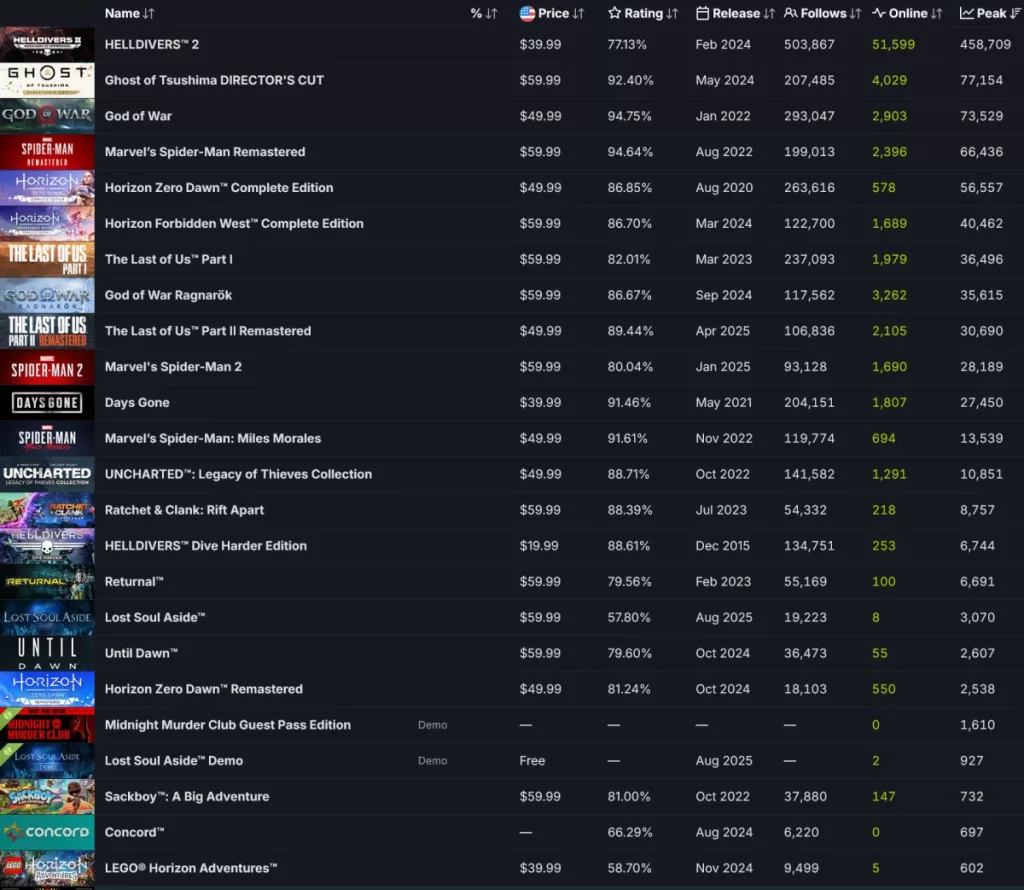 It hasn’t all been butterflies and roses with Sony’s PC releases. While official sales numbers are rarely, if ever, published, some tracking has been available via Steam. Horizon Zero Dawn Complete Edition, Spider-Man Remastered, and Ghost of Tsushima are topping the list with 56,557, 66,436, and 77,154 concurrent players, respectively. Other popular titles, such as Horizon Forbidden West and Last of Us Part II, dropped into 30,000-44,000 counts, and other single-player games were even lower. God of War had a peak of 73,529, while the second game only reached 35,615. Stellar Blade most recently set the record with over 190,000 players, which ironically was made by Shift Up, a studio that Sony does not own. Now it is important to note these numbers are only from one storefront, and each could be much higher if taking into account sales from Epic and GOG. Below is a list of Sony’s games published for PC, and notably, its multiplayer HellDivers 2 crushes everything else.