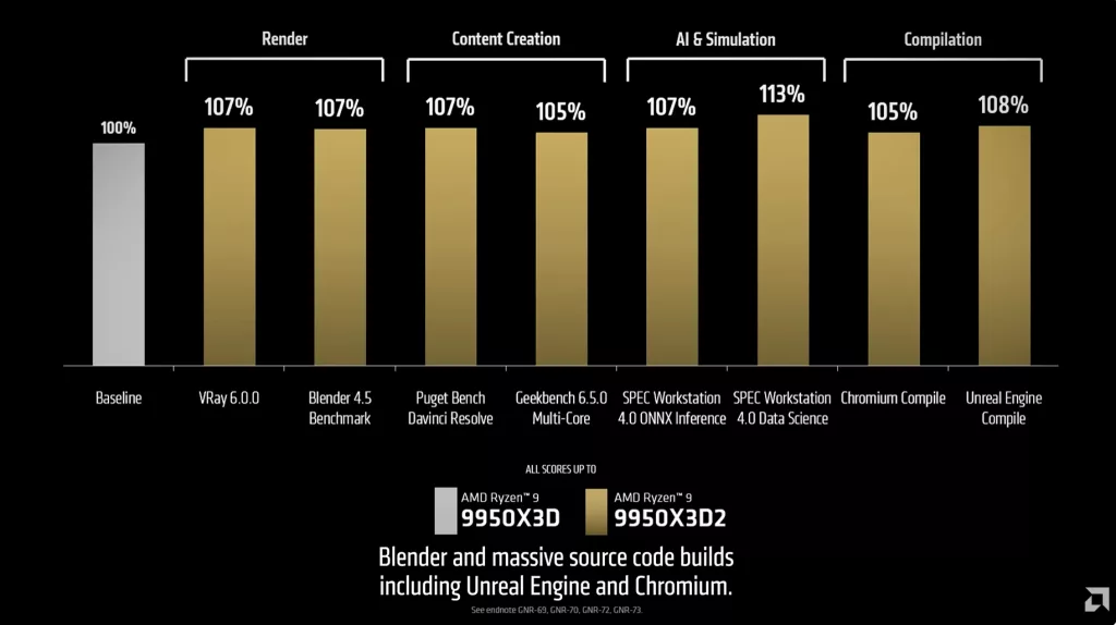 AMD is positioning this as a chip for creators and developers rather than pure gaming, though gaming performance should also benefit from eliminating the latency penalty that comes when a game thread running on the non-cached CCD of a standard 9950X3D has to reach across to the other chiplet’s cache. The company’s own benchmarks show gains of 5 to 13 percent over the 9950X3D in workstation-class tasks including V-Ray, Blender, DaVinci Resolve, Unreal Engine, and large-scale source code builds like Chromium. As AMD Senior VP Jack Huynh put it in the announcement video, “208MB of cache means more game data, more assets, and more working data sitting right next to the CPU cores.”