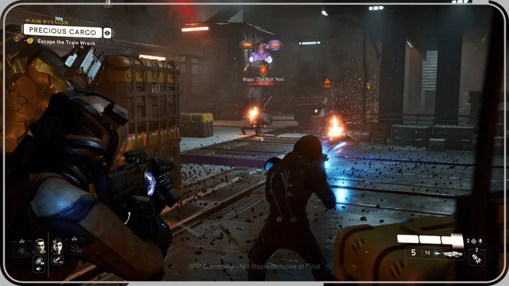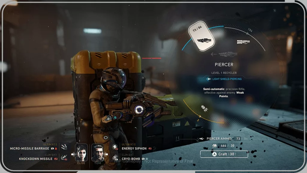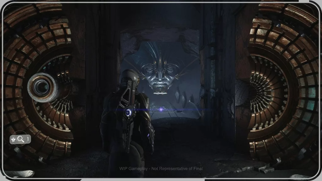 The sneak peek video shows the main protagonist, Jun Aslan, making his way through the corridors of Khonsu with teammates Tom and Elise as they encounter an ancient defense system. In this section, Jun is using a “Recycler” to engage enemies as he cycles through its repeater and shredder modes. When needed, he employs his guantlet “Lance” special ability to deal heavy damage to enemies by throwing livestone javelins.