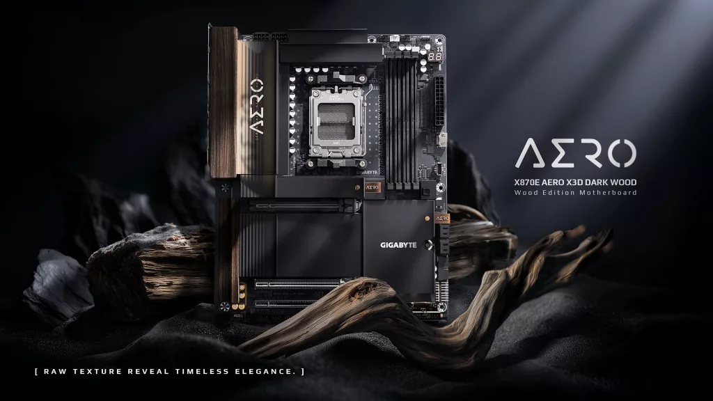 “X870E AERO X3D DARK WOOD whispers into your space like a gentle breeze bringing comfort and harmony. Its natural wood aesthetic evokes the warmth of home, transforming cold technology into something inviting belongs in your living room.”