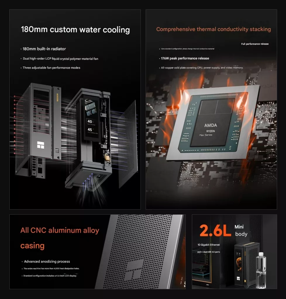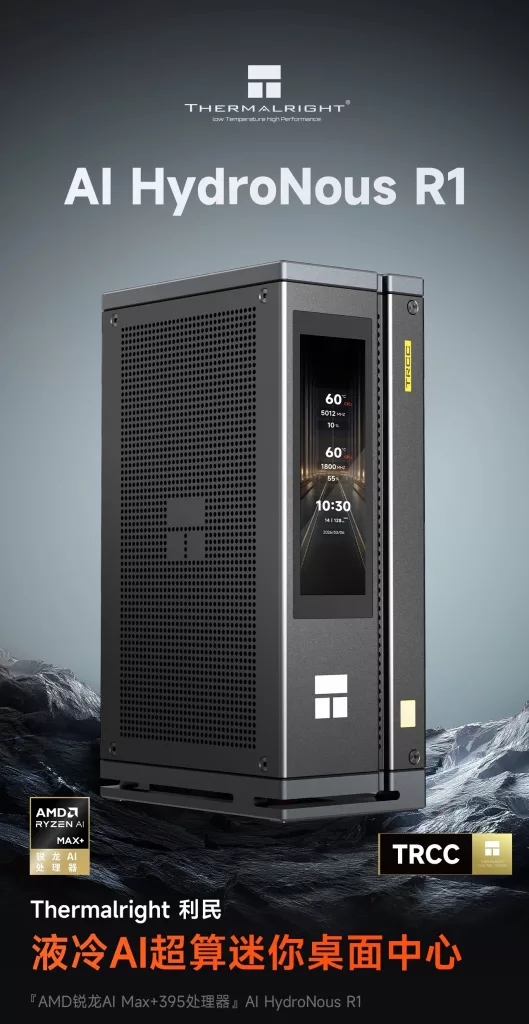 Thermalright has revealed a sleek-looking mini-PC engineered for performance with its custom-cooled Ryzen AI Max+ 395 processor. The AI HydroNous R1 has a lot going for it in its compact 2.6L form factor. With a 180mm built-in liquid cooling solution featuring a full copper cold plate and two liquid crystal polymer fans, the system supports three adjustable fan modes, allowing users to cool AMD’s flagship 16-core/32-thread APU. Thermalright has the processor running at 176 Watt TDP (56W over stock) to reach peak performance. An all-aluminum CNC chassis featuring an elegant-looking 4.6-inch LCD gives the PC a true look of quality to be appreciated, and that this $3,500 system is not an RGB-infested toy but a finely made PC.
