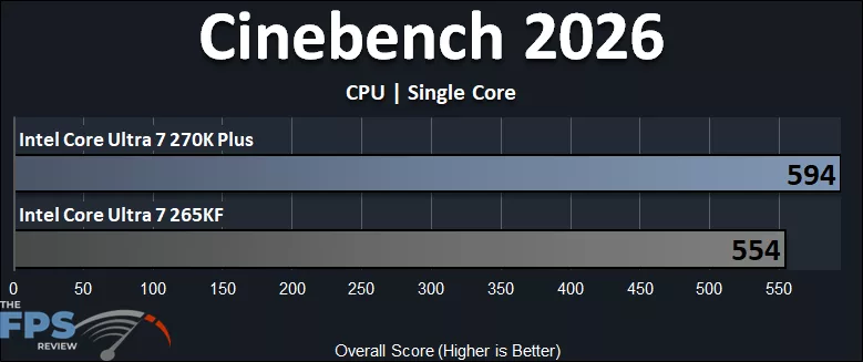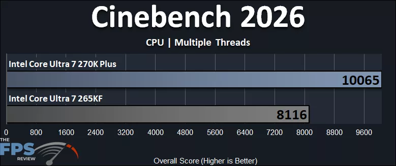 In Cinebench 2026, we saw the largest difference between the CPUs. Here, the Intel Core Ultra 7 270K Plus is 24% faster than the Intel Core Ultra 7 265K, which shows the advantage of the extra cores and clock speeds when utilized to the max.