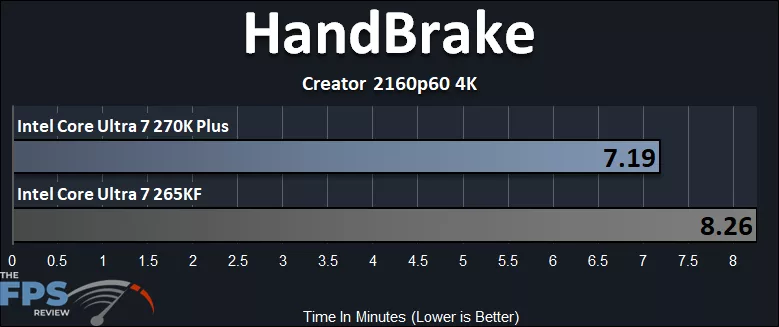 In HandBrake, the Intel Core Ultra 7 270K Plus transcodes this video at 13% less time, or faster, than the Intel Core Ultra 7 265K. This can make a difference in long renders for sure; it’s a meaningful improvement if you do a lot of video work.