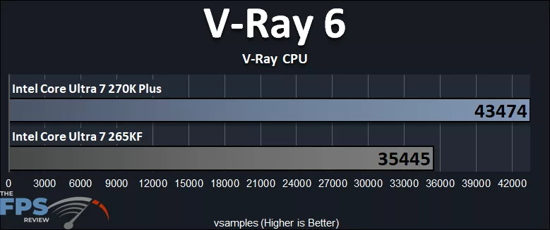 In the V-Ray 6 CPU benchmark, the Intel Core Ultra 7 270K Plus is 23% faster than the Intel Core Ultra 7 265KF, which aligns with Cinebench’s workload. This shows that the Intel Core Ultra 7 270K Plus is a powerhouse for content creation and rendering work compared to the 265K.